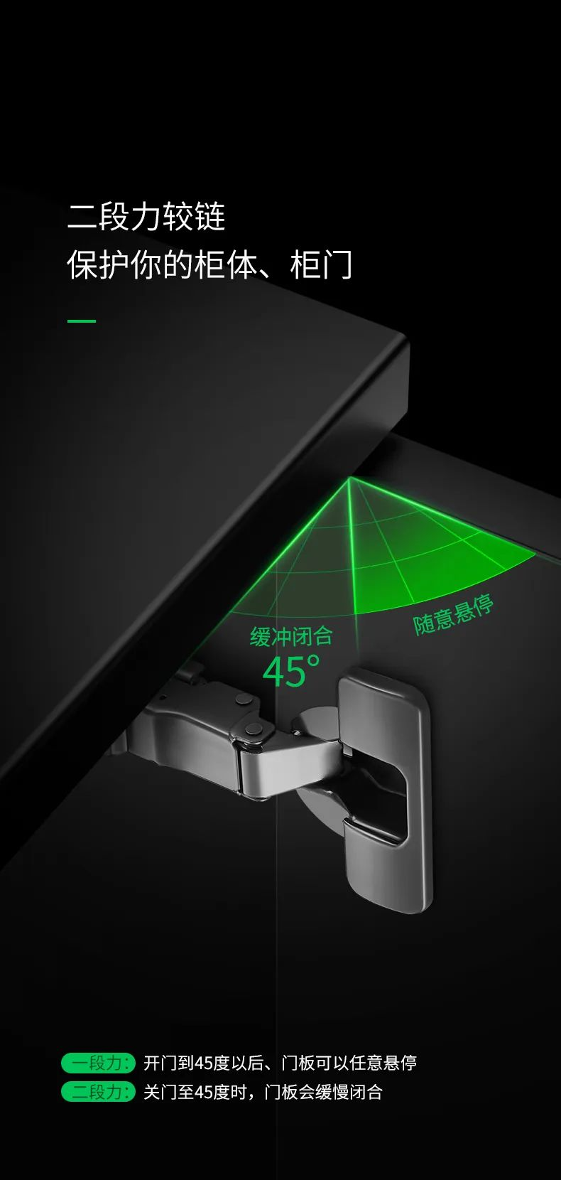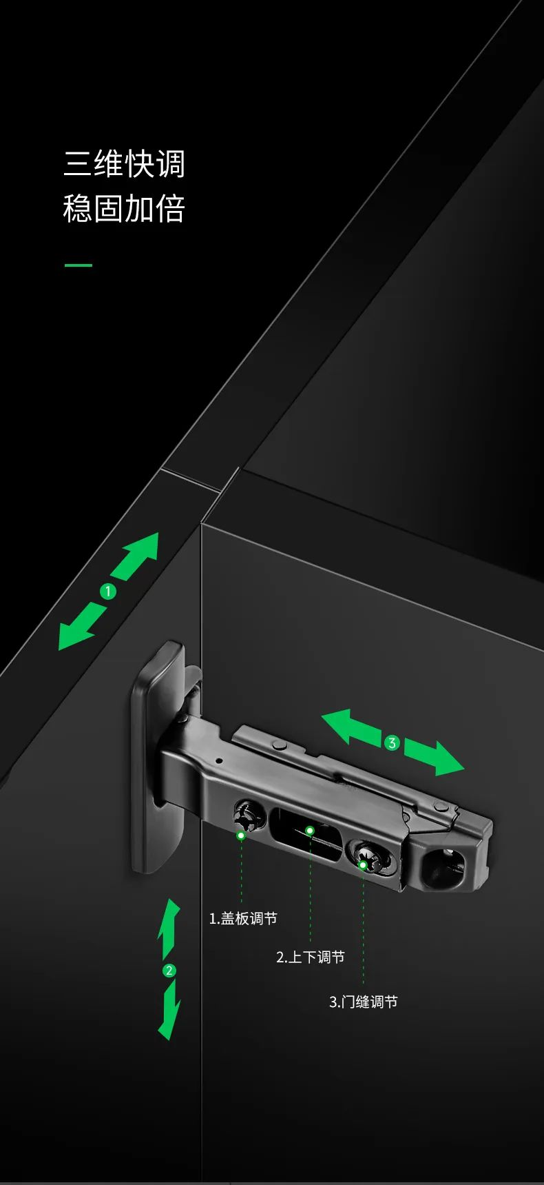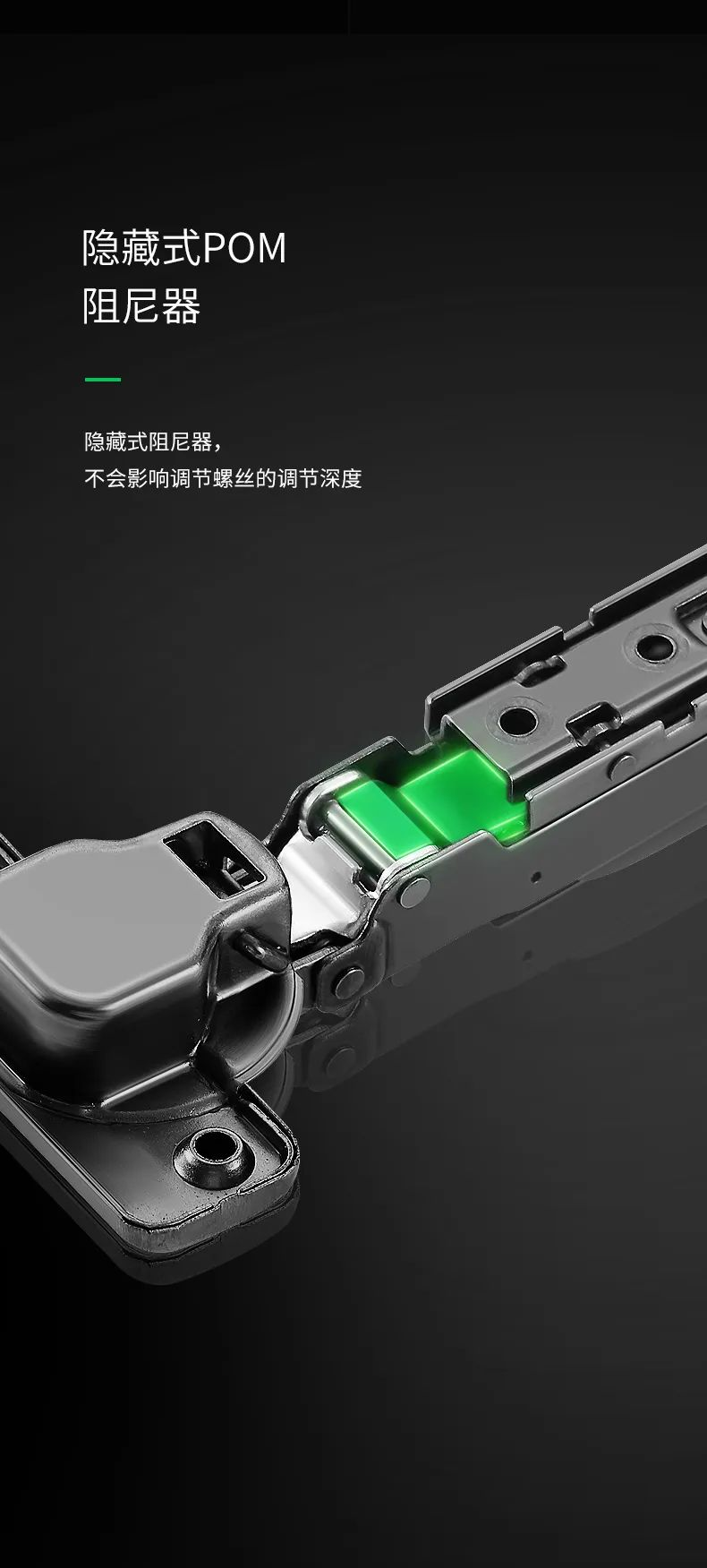 2、兩段力結構3、隱藏式POM阻尼器4、16-25mm厚薄門板,靈活應用5、三層電鍍,防蝕耐銹6、一字底座,安裝牢固7、三維快調,穩固加倍8、無螺絲外露,時尚美觀