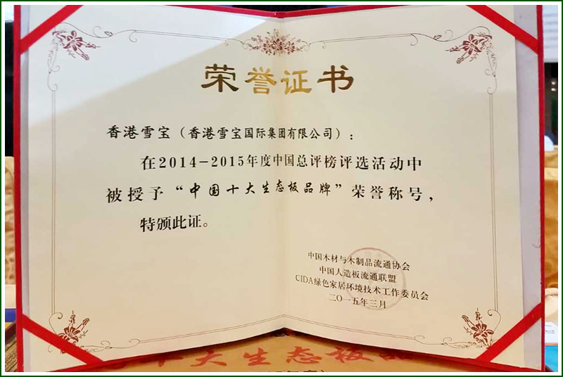 雪寶榮獲中國人造板總評榜:2014年度十大生態板品牌