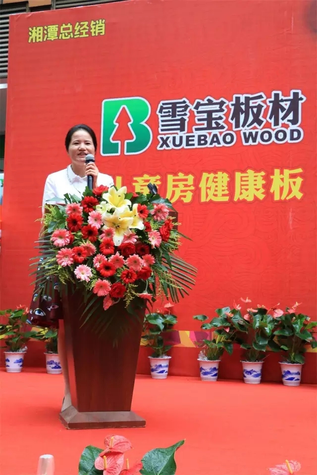 ▲雪寶板材湘潭旗艦店總經理劉輝群女士為開業典禮致辭