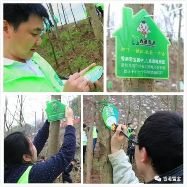 ▲雪寶家人為樹苗掛上統(tǒng)一的標識牌并寫下美好心愿