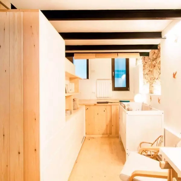 兒童床靠墻而放節(jié)省空間,柵欄式設(shè)計(jì)提高小床的安全性。而在走道上放置桌椅,則是不浪費(fèi)任何空間位置的表現(xiàn),木質(zhì)的桌椅搭配綠色地板,相融相諧,盡添空間的自然風(fēng)味。