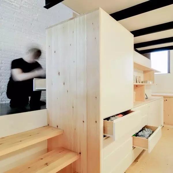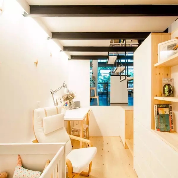 背景墻保留了裝修前的模樣,古舊簡(jiǎn)陋的墻壁為角落空間增添了工業(yè)風(fēng)和復(fù)古風(fēng)。儲(chǔ)物柜作為嬰兒房的收納空間,其頂部與地面層持平,成為了走廊空間。因?yàn)榈蹴斪銐蚋撸宰咴谏厦嬉膊粫?huì)碰頭。