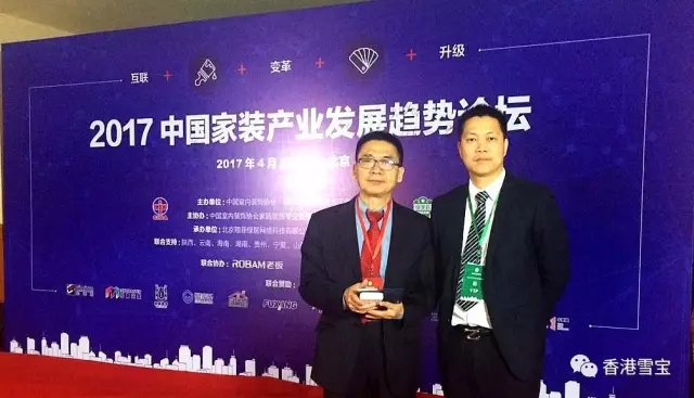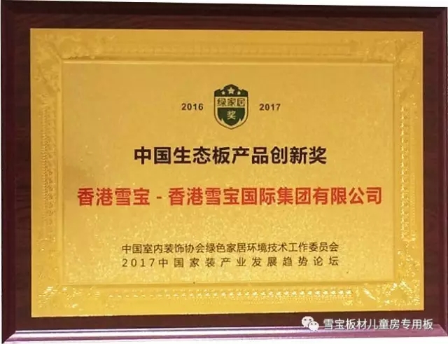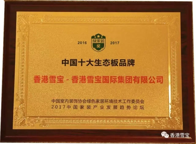 2017年4月27日-28日,由中國室內裝飾協會,綠色家居環境技術工作委員會聯合主辦,中國室內裝飾協會家居裝飾專業委員會和中國家居聯盟協辦的“2017家裝產業發展趨勢論壇”在北京順利舉行,香港雪寶品牌憑借過硬的環保品質和廣泛的消費者認可度,蟬聯“2017年度中國十大生態板品牌獎”和“中國生態板產品創新獎“兩項殊榮,為品牌實力加冕冠譽。