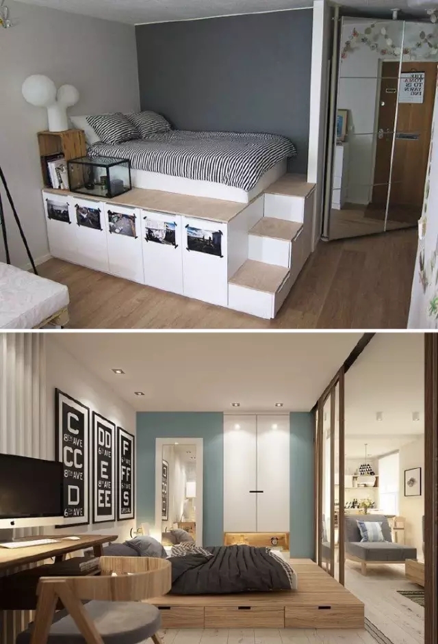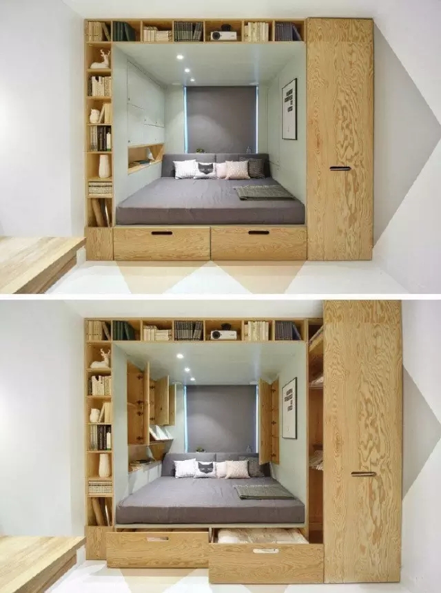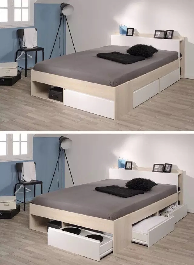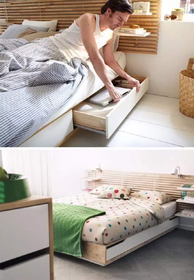 將抽屜和床架融為一體,醒來就能拿到更換的衣服或者也可以放上電腦手機,立馬工作,平時看上去就是個普普通通的床,將一切雜亂隱于無形,是不是很理想?