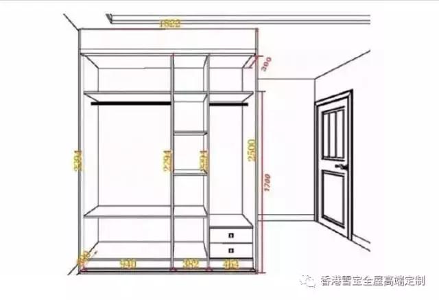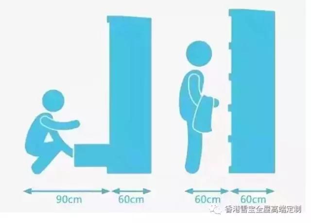 關(guān)于衣柜預(yù)留位置,還需要注意的是,普通衣柜的進深一般為60cm,結(jié)合柜門與抽屜打開時的尺寸考慮,需要給衣柜前方預(yù)留60cm-90cm的空間。