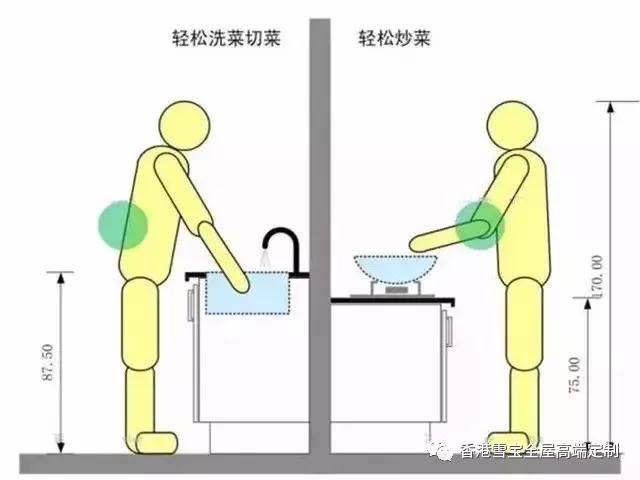 ②臺(tái)面高度:炒菜臺(tái)面一般750mm舒適,洗切菜臺(tái)面一般875mm感覺(jué)更舒適。